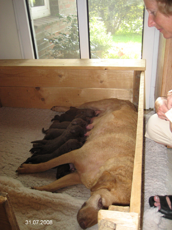 Tessa am Morgen des 17. JuliIn der Nacht vom 16.07.08 auf den 17.07.08 (offzieller Geburtstag aller Welpen:-) !) kamen die Welpen ohne irgendwelche Probleme auf die Welt. Nun wollen 4 Rüden und 4 Hündinen ins Leben wachsen.